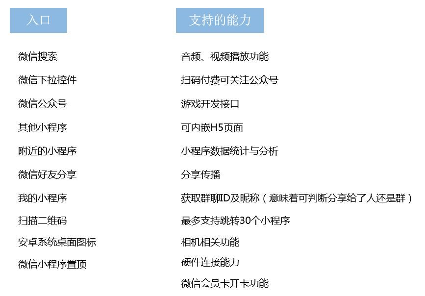 综述,结合一年小程序的迭代情况。我们能看出迭代速度和能力开放的维度都有了更大的加持。根据公开的迭代信息, 目前小程序可支持的能力如下图。